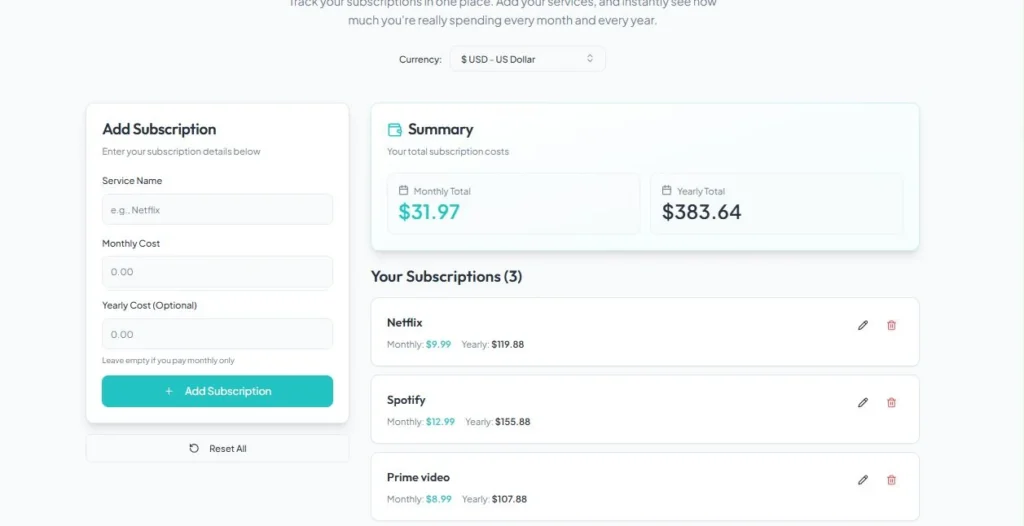Step 3: View your totals instantly. The monthly subscription calculator shows your combined monthly cost and projects your yearly expense.